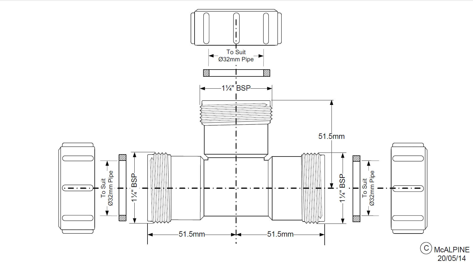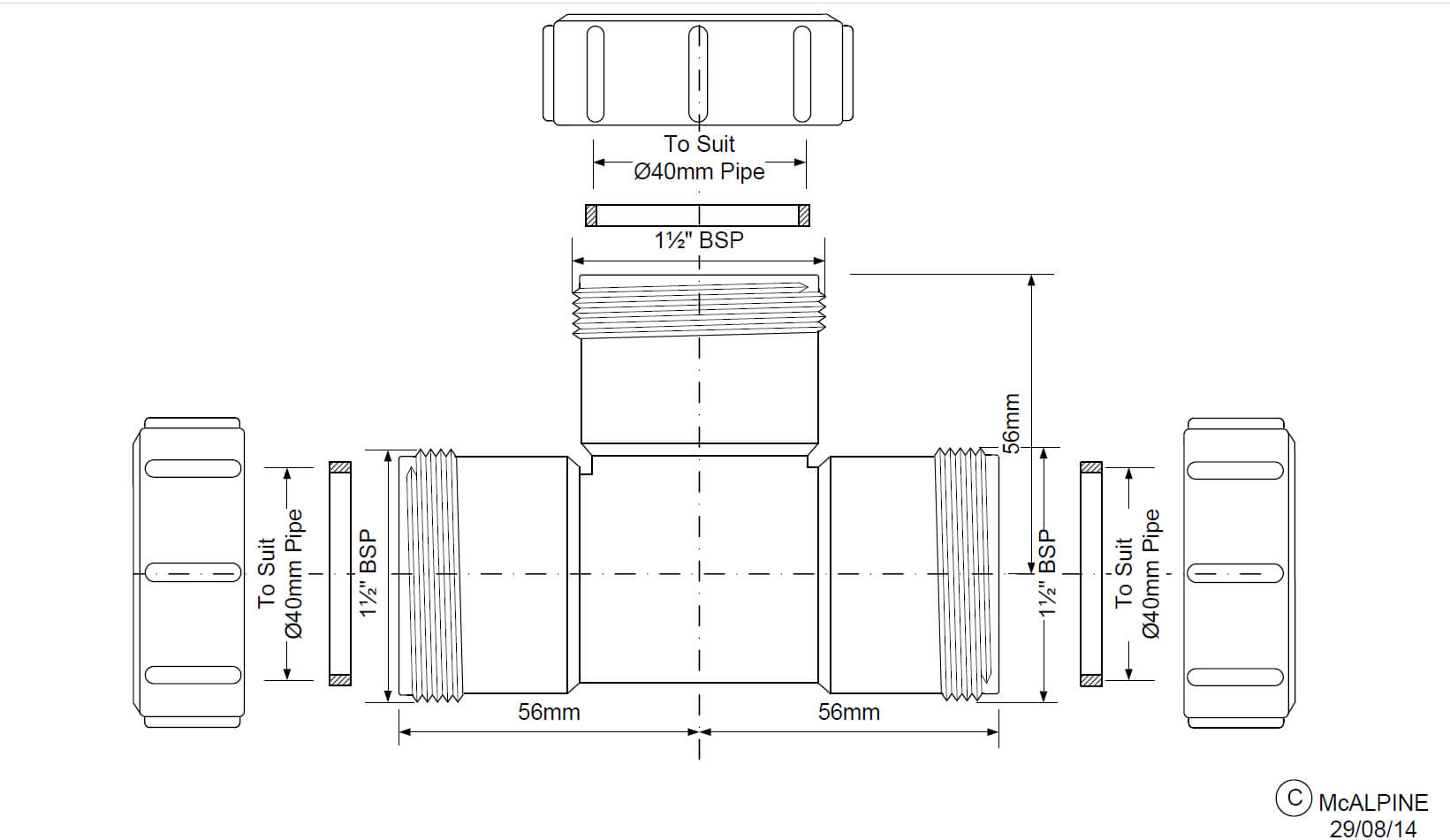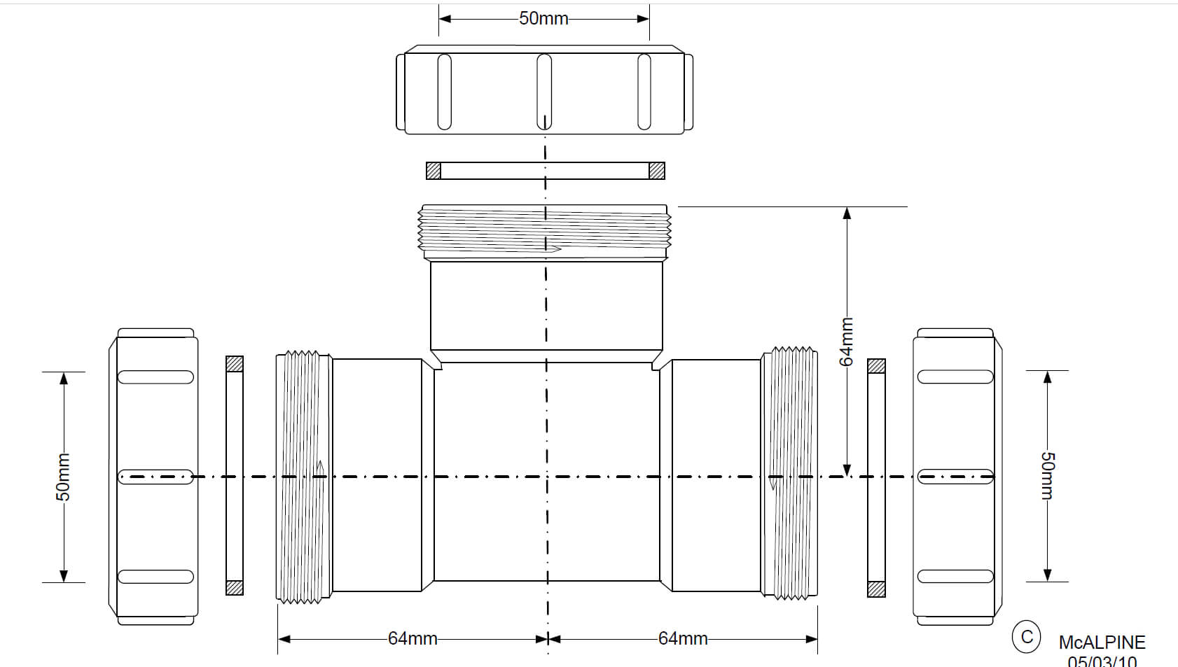 T-Stück mit drei Überwurfmuttern und drei Dichtungen für Rohrverbindungen in Sanitär- und Abwassersystemen