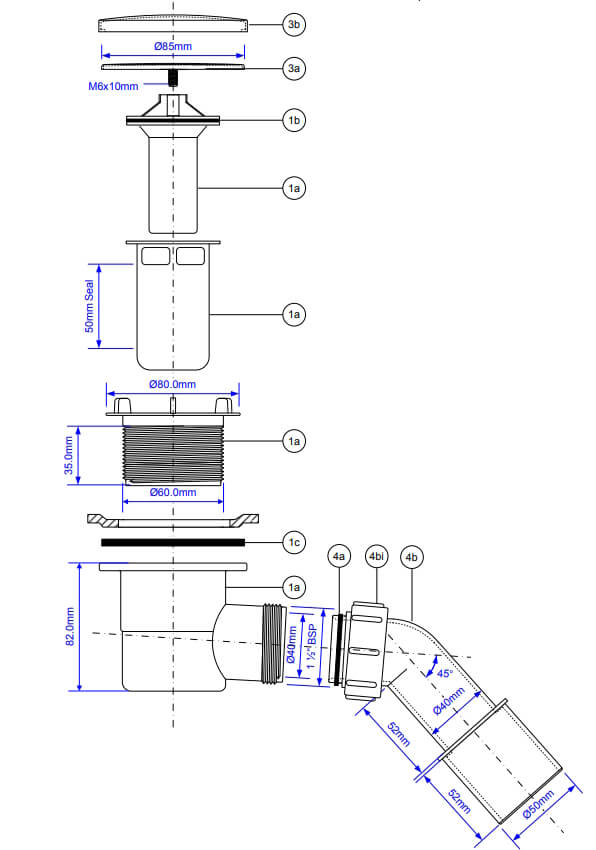 Die verchromte Edelstahlabdeckung hat einen Durchmesser von 85 mm. Der Ablaufbogen ist im 45°-Winkel ausgeführt und verfügt über einen Ø40/50 mm Anschluss. Optional kann ein flexibler Anschlussschlauch mit 6/4 Zoll Gewinde verwendet werden.