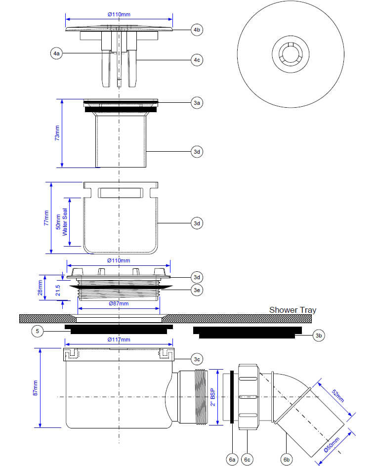 Dieser Duschablauf ist für Duschtassen mit einem Ablaufloch-Durchmesser von 90 mm vorgesehen. Er hat eine Einbauhöhe von 90 mm und verfügt über eine Ablaufleistung von 50 Litern pro Minute gemäß DIN-Norm. Der patentierte, von oben entnehmbare Reinigungseinsatz ermöglicht eine einfache und schnelle Wartung des Siphons.