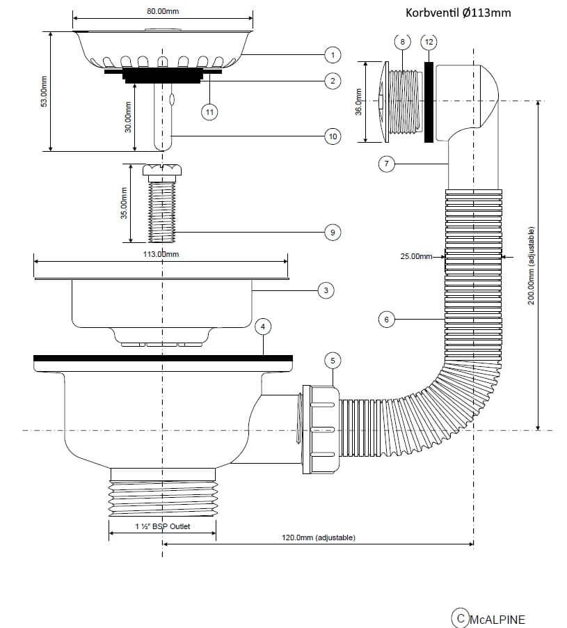 Spülen Korbventil mit Sieb aus Edelstahl, Korb, Dichtung und Befestigungsschraube