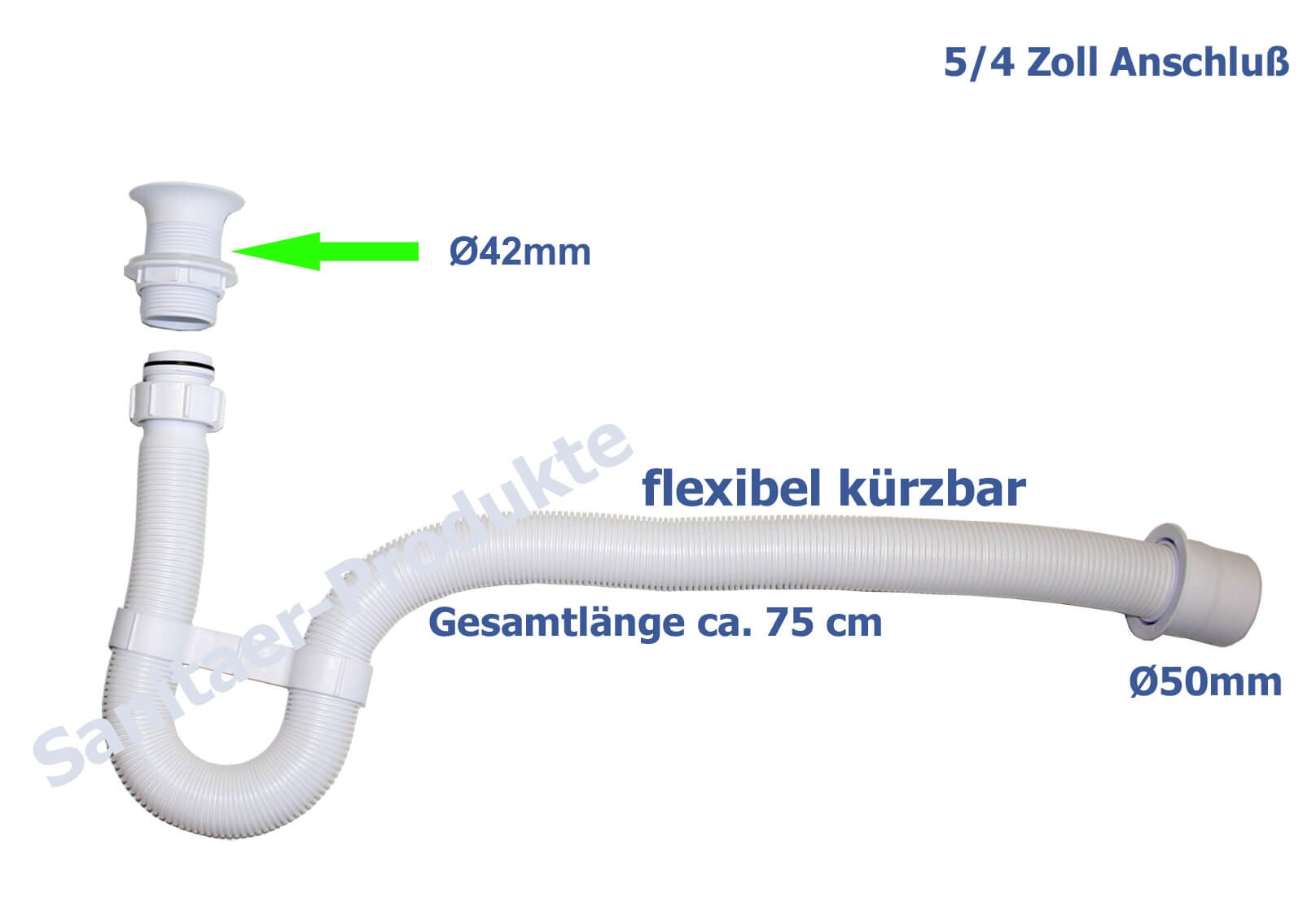 Dieser flexible Siphon passt für alle gängigen Waschbecken und Waschschalen. Er ist aus weißem Kunststoff gefertigt und lässt sich problemlos montieren. Die Ablaufgarnitur ohne Überlauf hat einen Durchmesser von 42 mm. Der Siphon verfügt über einen 5/4 Zoll Standardanschluss und einen Abgang von 50 mm. Der Siphon ist flexibel kürzbar und eignet sich für den Einsatz im Badezimmer.